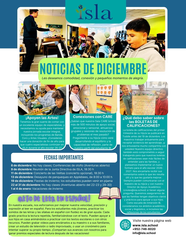 In today's polarized world, my plea is that we in our ISLA corner are attuned to the many stories that make us great. We need to talk in class and at home about our values that all people deserve dignity and respect. May we openly celebrate the richness of our community - the Christmas songs, the Kwanzaa symbols, the Hanukkah traditions, the Diwali festivities, and beyond our holidays, the strengths and beauty of our diverse school. Language or actions that minimize humans in our community are not acceptable.